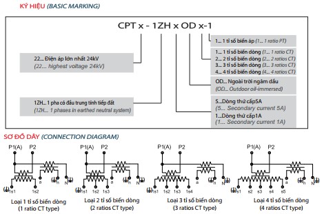 - CPTx-1ZHxODx-1 được thiết kế một hay hai tỉ số, có thể thay đổi tỉ số bằng cách đổi nối phía thứ cấp.